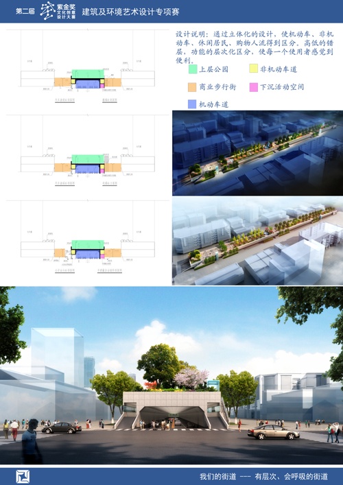 設計說明:本設計使街道下沉1米,其上做騰空花園,使街道形成一個隧道,凈高超過4.5米,滿足消防車通行。上層為開敞式公園,使街道兩側居民出門后面對的即時交流空間,而不是滿眼的車水馬龍……