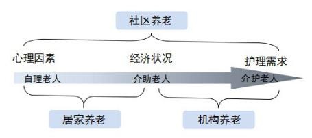 我國養老模式已從傳統的家庭養老發展成為以居家養老為主,社區養老與機構養老并行的多重模式。《老年人建筑設計規范》中將老年人根據健康狀況劃分為三種類型,1自理老人:生活行為完全自理,不依賴他人幫助的老年人。2介助老人:生活行為依賴扶手、拐杖、輪椅和升降設施幫助的老年人。3介護老人:生活行為依賴他人護理的老年人。三個階段實際上是每一位老人都需經歷的一個整體,我國老年人對養老設施的選擇是在社會制度、個人養老需求、經濟情況和心理因素等多個要素下綜合考慮的結果(圖1)。